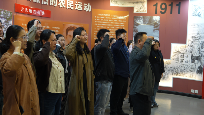 参观完展馆,全体党员面向鲜红的党旗,举起右拳,重温入党誓词。“我志愿加入中国共产党……随时准备为党和人民牺牲一切,永不叛党。”铿锵有力的誓言在展馆内空回荡,彰显着同志们对党的无限忠诚和为共产主义事业奋斗终生的坚定决心。这一刻,初心被再次擦亮,使命被牢牢铭记。