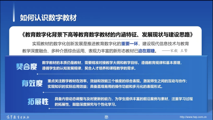 在长达一个多小时的精彩分享中,袁玮老师以“数字教材的建设与发展”为主题,进行了一场系统性强、信息量大的专题讲座。深入解读了国家关于教育数字化及教材建设的系列方针政策,强调了数字教材作为“国家事权”的重要组成部分,在构建高质量教育体系中的战略地位。她指出,数字教材已不再是传统纸质书的简单电子化,而是融合了音频、视频、交互式习题、虚拟仿真等多媒体元素的新型教学产品,是推动“课堂革命”的关键支点。