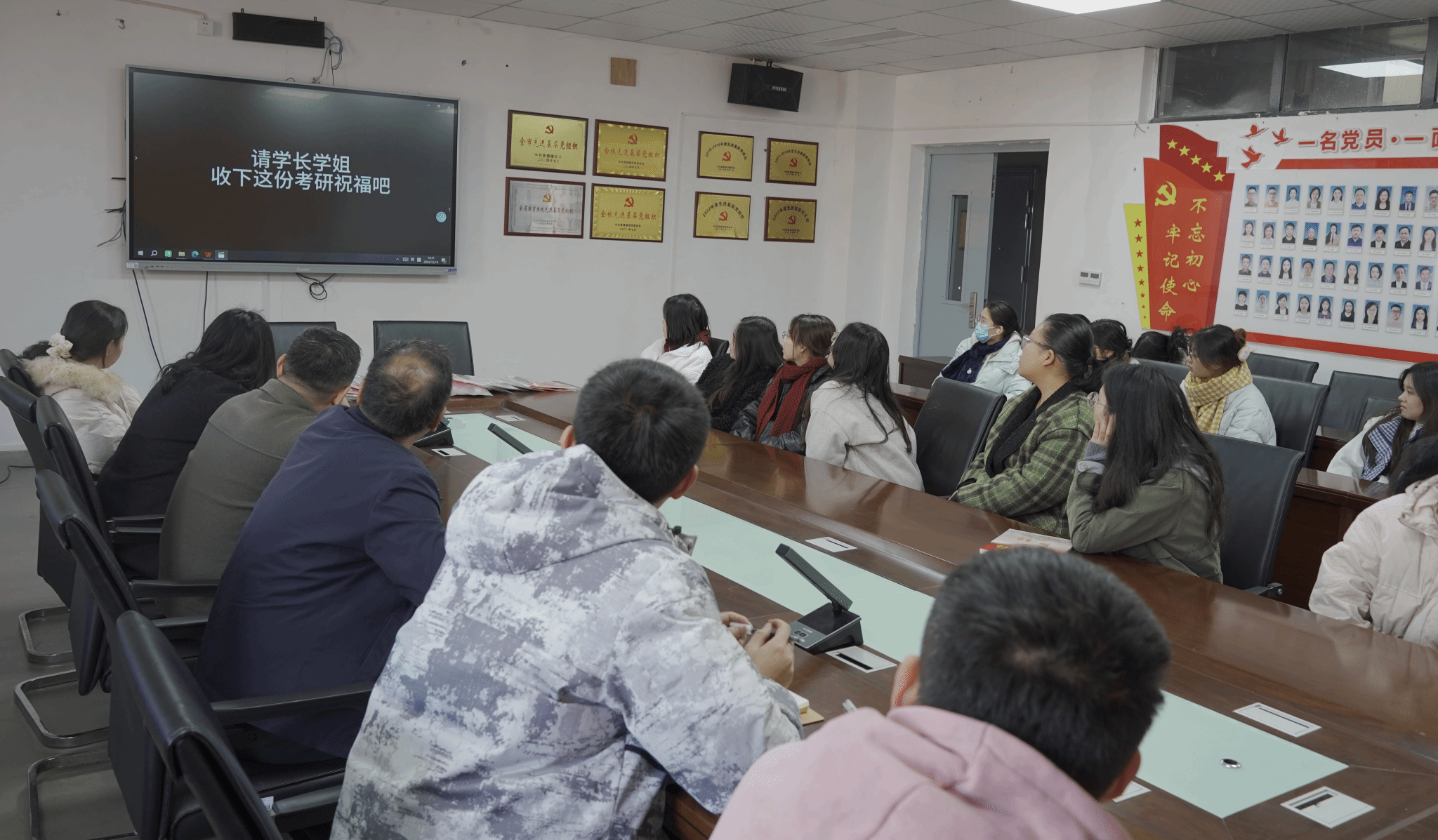 活动现场播放了学院精心录制的考研祝福视频,视频中学院老师和同学们一起为考研学子们加油鼓劲,表达了学院对大家的关心与支持。一句句暖心的话语蕴含着对考研学子们的深情祝愿与殷切期许,考生们认真观看,收获满满祝福。最后学院还为每位考生精心准备了 “暖心助力”文具礼包,领导与老师们亲自为考研学子分发。一份小小的“暖心加油包”满载着深情厚谊,寄托着对同学们前程似锦的美好祝愿,现场暖意融融,满溢温情。