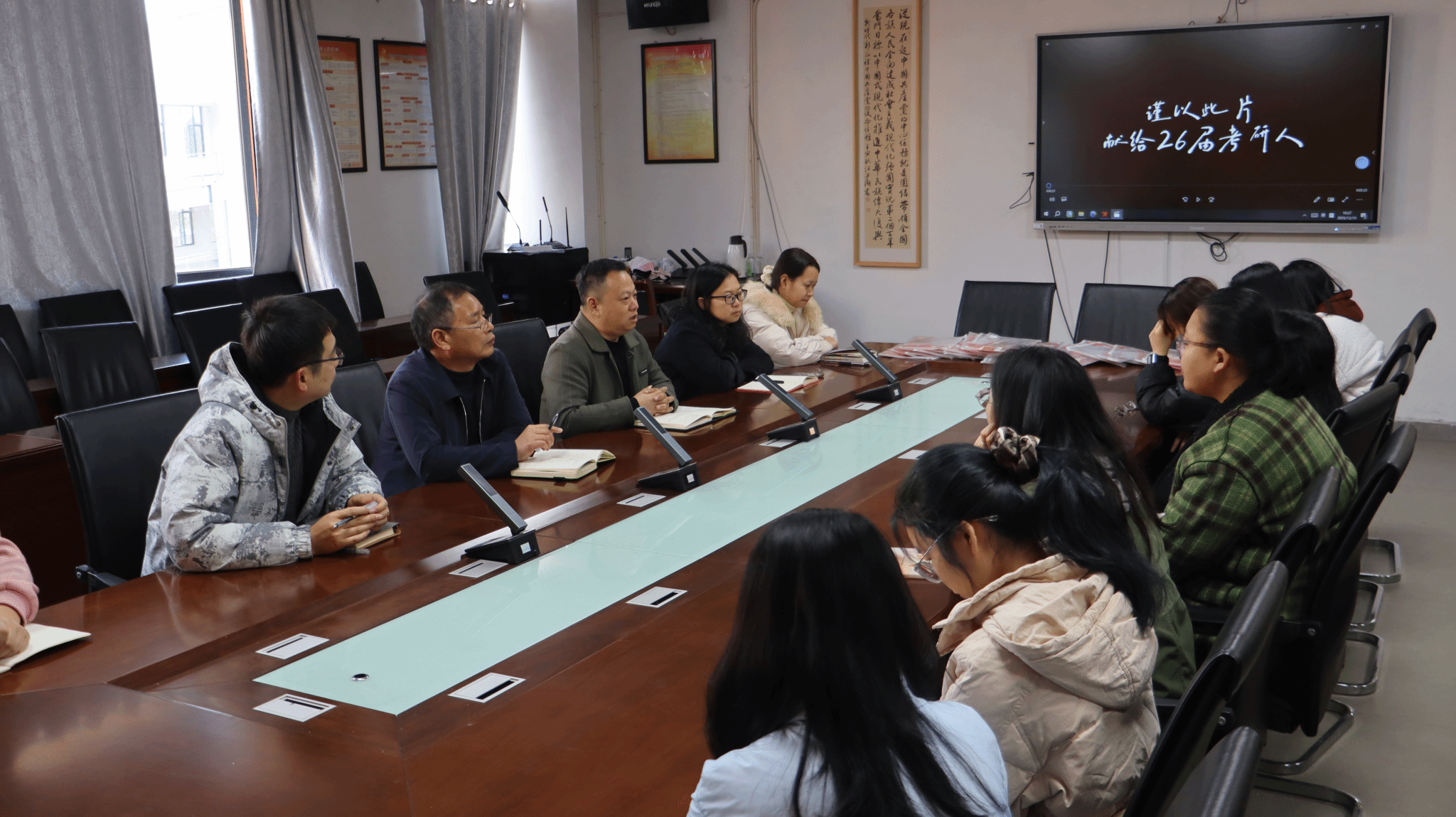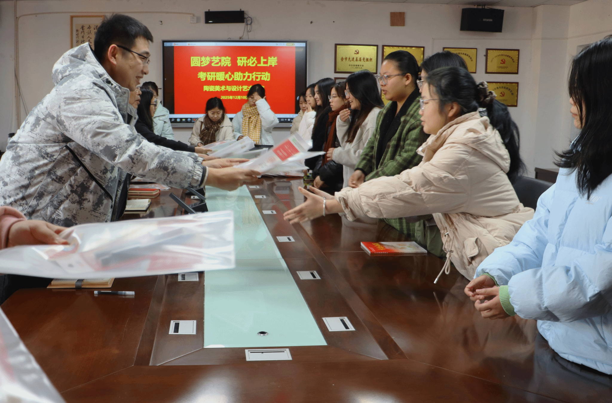 2026届全国硕士研究生招生考试在即,为助力考研学子缓解考研压力、增强备考信心,12月10日,陶瓷美术与设计艺术学院在党员活动室开展“圆梦艺院,研必上岸”助力考研暖心行动,学院党委书记陈后辉,党委副书记胡文毅出席活动,学工科副科长张朋,毕业班辅导员及2026届考研学生参与此次活动,活动由张朋主持。