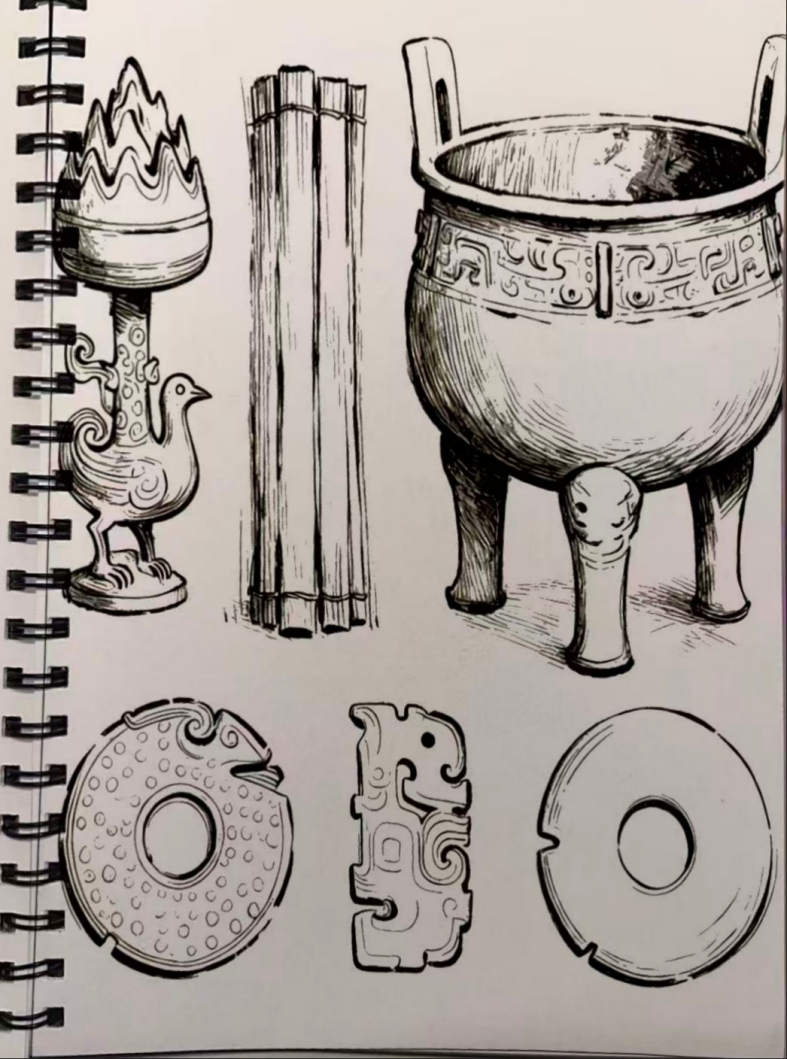 考察结束后,指导教师王强、蔡锐组织学生开展成果整理与再创作工作,鼓励大家围绕“地域文化解读”“博物馆展陈分析”“传统技艺转化”等方向进行手绘表达与创意重构。将考察素材形成“艺术考察手绘优秀作品汇展”,作品形式多样,包括建筑速写、展品线描、场景还原、信息图表、文化符号提炼等,既有严谨的学术性,又具个性化的艺术表达。部分作品还结合教学情境,尝试设计中小学美育课程插图或展板脚本,体现出未来艺术教师的专业自觉。
