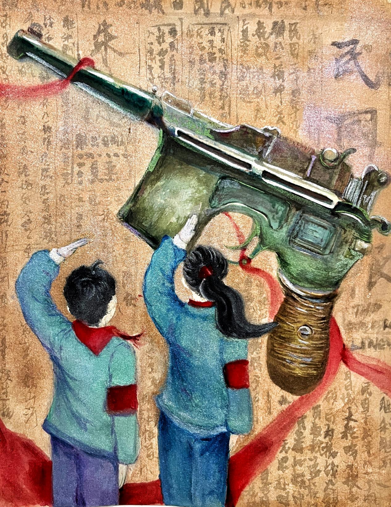 整幅作品通过“报纸-枪-人”的三角构图,将历史文献、革命器物和当代青年有机联结,形成过去、现在与未来的三重时空叠印。水彩的层叠透明特性表现历史的沉淀感,而珠光颜料在不同光线下的显隐变化,增强了作品的互动性和当代性。这幅画不仅是对历史的回顾,更是对当下的提醒:那些用鲜血和生命换来的宝贵精神财富,值得被我们永远铭记、深刻理解并持续传递。