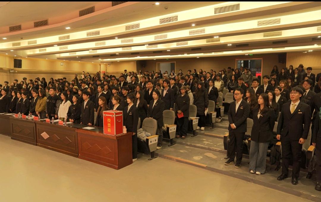 2025年11月20日,景德镇学院陶瓷美术与设计艺术学院团委、青年志愿者协会、新媒体中心换届大会在图文报告厅顺利召开。 陶瓷美术与设计艺术学院党委书记陈后辉、副院长程幸、学工科副科长张朋、团委副书记曹星、学生会指导老师王智元、团委指导老师吴欢蓓、伊珍,新媒体中心指导老师王锦瑶、姜蓝瑄以及学生组织全体成员参加本次大会。大会由24美术学1班王靖涵、24工美2班罗喆主持。