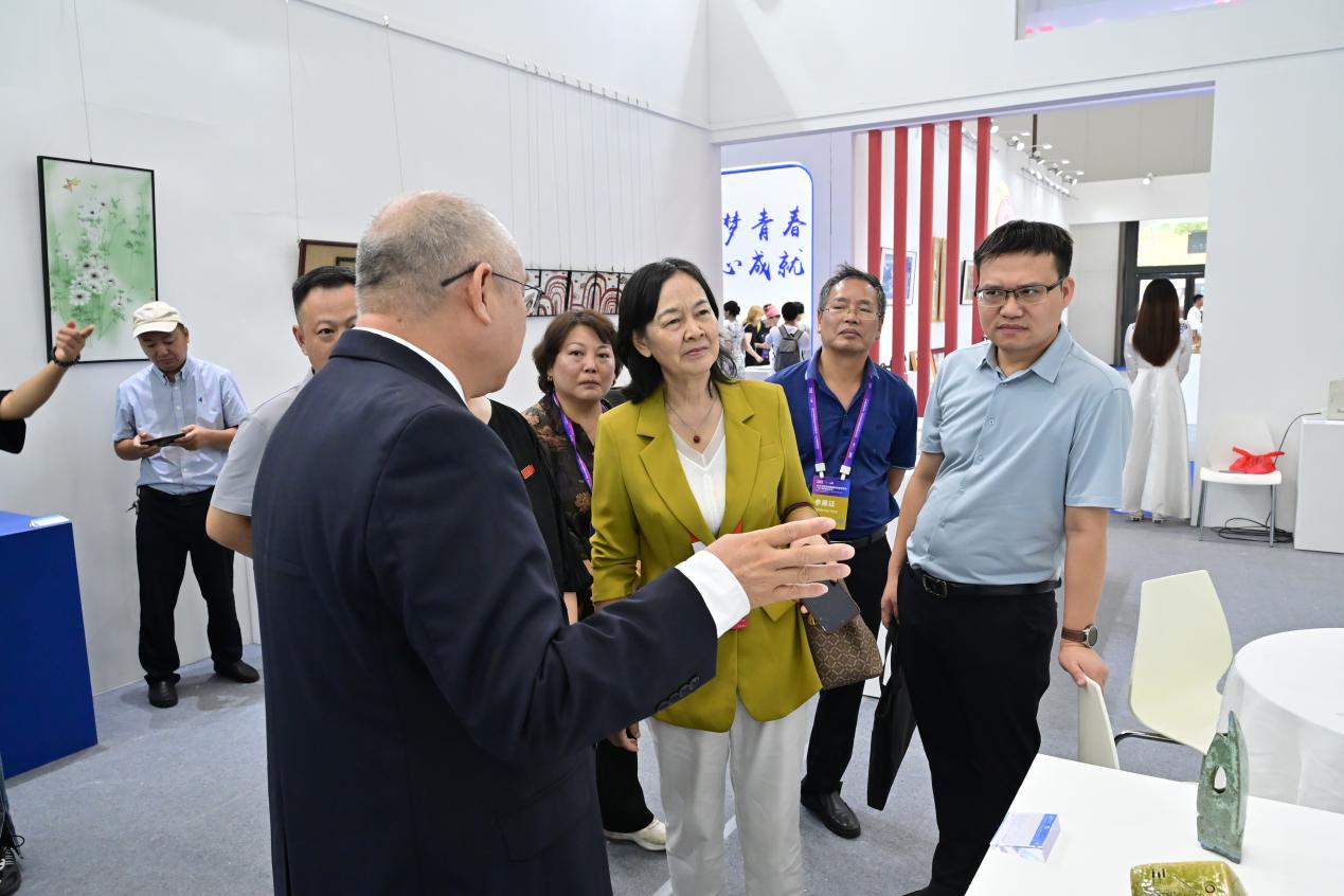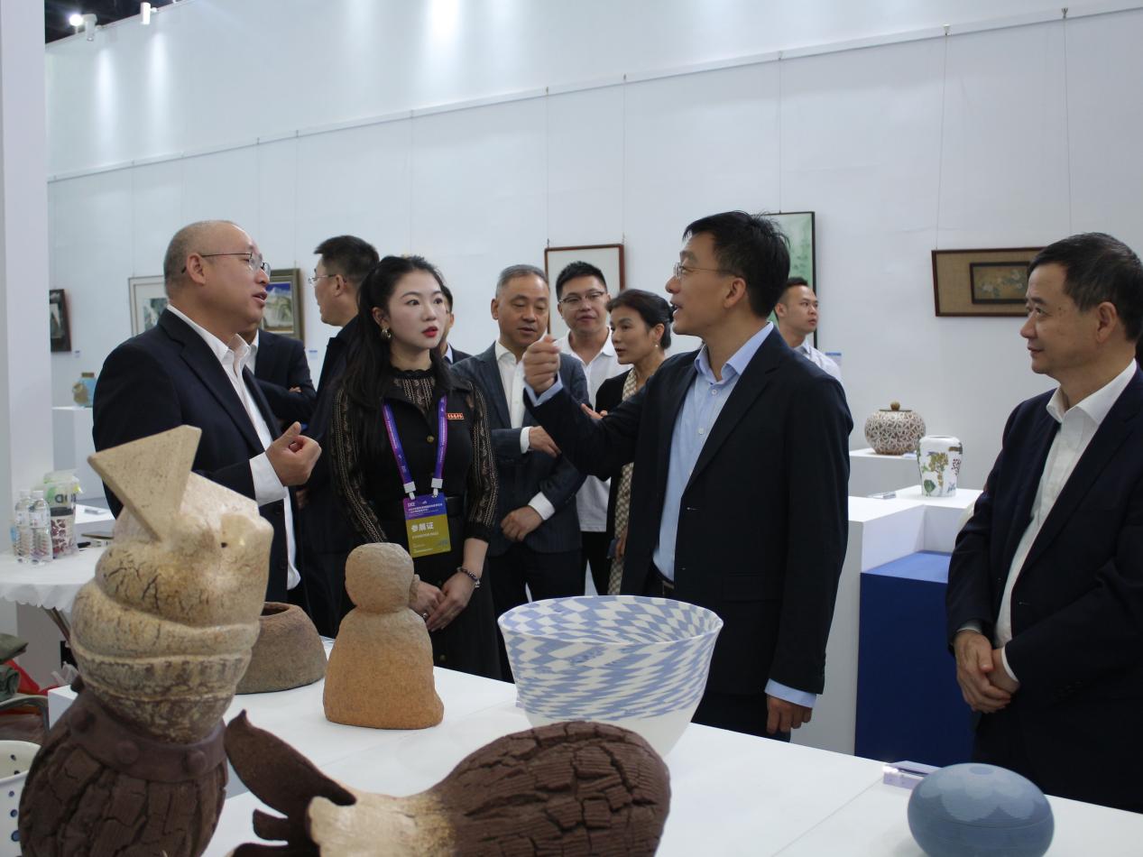 景德镇市委副书记、市长陈克龙,民革江西省委会主委熊皓,校党委书记陈小林,党委副书记、校长熊震宇,党委委员、副校长方漫,党委委员、宣传部部长赵雪政先后来到我校展览现场参观,并对展览给予了高度评价。展览现场,他们认真听取了陶瓷美术学院院长张博关于展览策划、作品创作背景与教学成果的汇报。她指出,陶瓷是中华文明的重要名片,景德镇学院作为教育部中华优秀传统文化艺术传承基地,肩负着传承与发展陶瓷文化、推动陶瓷艺术教育创新的时代使命。此次展览不仅是学校教学成果的集中展示,更是践行文化自信、服务“一带一路”倡议的具体行动。