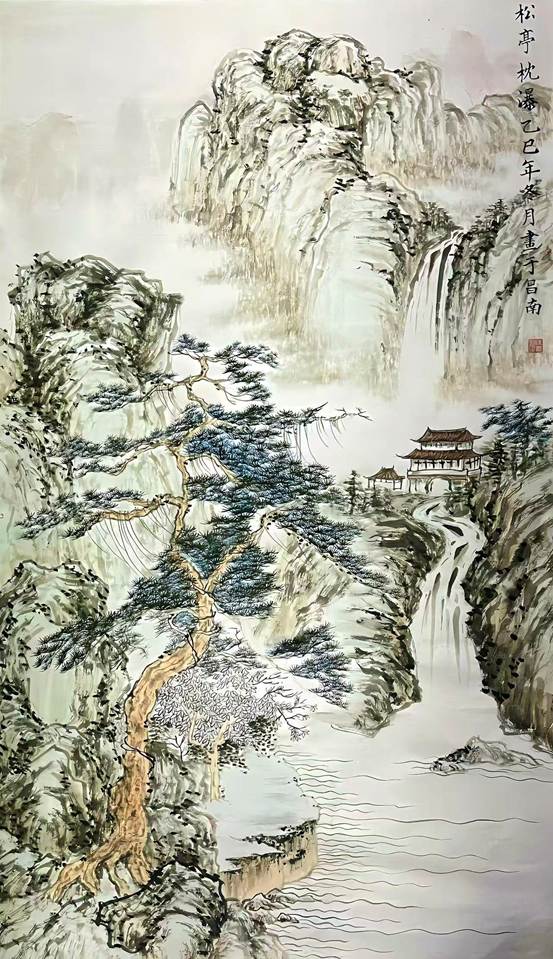 创作心得:学国画山水前,我因儿时接触过花鸟而满怀好奇。从临摹石头、山峦、松树,到掌握多种皴法完成完整稿,技法日渐扎实。这幅《松亭枕瀑》是庐山写生的灵感结晶,我偏爱松树挺拔的姿态,便以它为核心构景,乙巳冬月于昌南落笔。创作中以焦墨勾山石、披麻皴塑纹理,花青调墨写松针,让苍松劲挺与瀑布灵动相映,借山水虚实抒发对自然的向往,也让昌南文脉融于笔墨间。