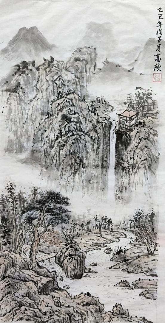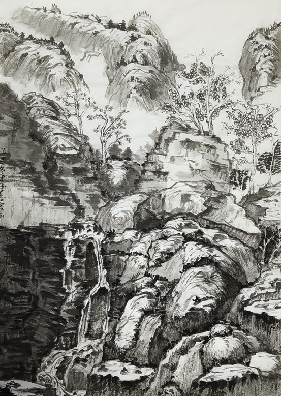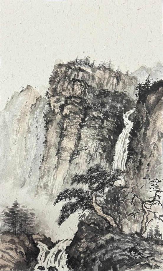 创作心得:这幅山水画作的创作,让我对传统笔墨有了更深体悟。勾勒山石时,以中锋行笔立骨,侧锋皴擦显肌理,干湿墨色层层叠加,力求表现岩峰的苍劲质感。瀑布以留白喻水势,借墨色浓淡衬云雾,虚实间营造深远意境。创作中深感“外师造化,中得心源”之理——既要对自然山川细致观察,更需将情感融入笔墨。虽仍有不足,却在反复晕染、调整构图中,体会到国画“写”意而非“画”形的精髓:于黑白之间见气韵,于简繁之中藏乾坤。