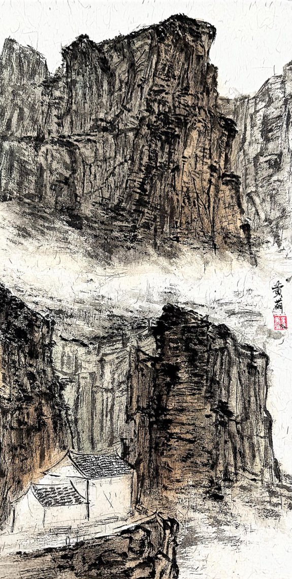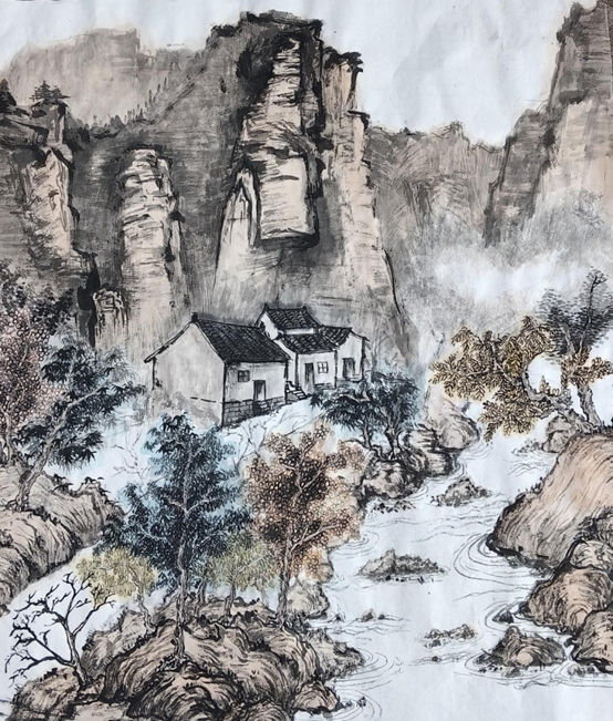 创作心得:这幅山水创作以大山景致为蓝本,落笔时先以焦墨勾勒岩壁的嶙峋肌理,用斧劈皴表现山石的刚硬质感,再以淡墨层层晕染出峰峦的虚实层次。溪涧以留白衬水势,屋舍藏于山坳间,添入生活意趣。设色上轻施赭石、花青,让秋树与山石形成冷暖呼应。创作中力求在传统山水的笔墨法度里,融入对自然实景的切身感悟,让笔下山水既有古意,又具鲜活的自然生气。
