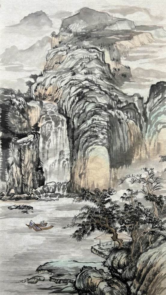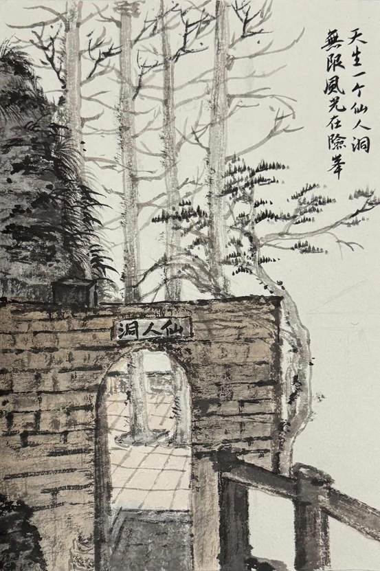 创作心得:伫立庐山仙人洞前,石墙的斑驳肌理、苍松的虬曲枝干与高耸的杉树瞬间抓住了我的视线。我以水墨为媒,先以焦墨勾勒石砖的棱角与树木的骨架,再用淡墨层层晕染出山石的厚重与林木的空濛。题款选用“天生一个仙人洞,无限风光在险峰”,既是对眼前景致的呼应,也想借笔墨留住这份险峰之上的磅礴气韵。写生途中,我更懂得笔墨当随实景,于自然中捕捉生机,方是山水画的灵魂所在。