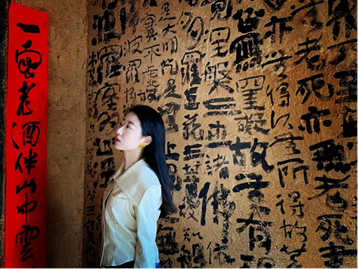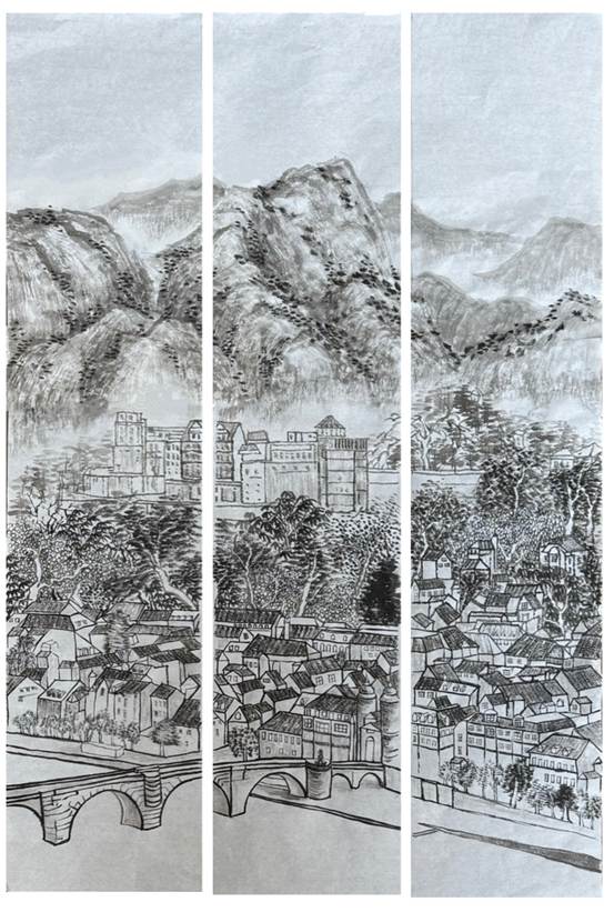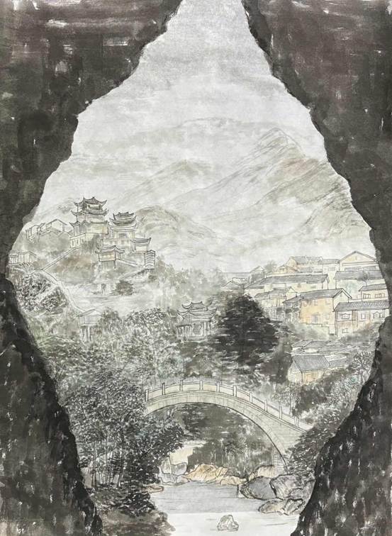 创作心得:这次写生的作品以及结课作品,灵感来自实地所见的景致。站在五老峰下,亭台与苍松相映,用淡墨白描勾勒亭台,焦墨点染松枝,留住这份古朴。望仙谷的洞窟观景视角来源于景德镇御窑厂,就以重墨绘洞窟作框,淡墨晕出云雾山水,让谷中楼阁石桥若隐若现,把山水间的仙意定格在纸上。