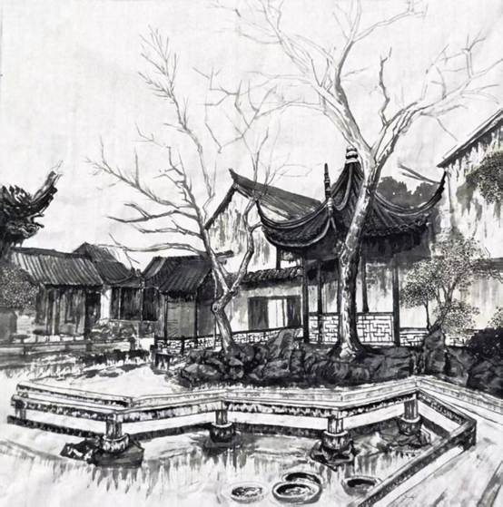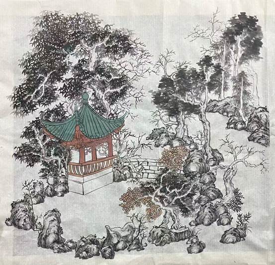 创作心得:这幅江南园林写生作品,是我山水课学习的一次实践尝试。勾勒亭台廊榭时,我着力用中锋表现建筑的规整线条,而绘枯树虬枝则以侧锋出笔,让枝干更具苍劲之态。墨色上,我用浓墨点染假山,淡墨晕染水面,试图营造空间层次,却仍觉水的灵动与建筑的古朴交融得不够自然。这次写生让我明白,国画写生并非简单复刻实景,而是要在笔墨间融入对景致的理解,做到“意与景合”,这也成为我后续研习的方向。