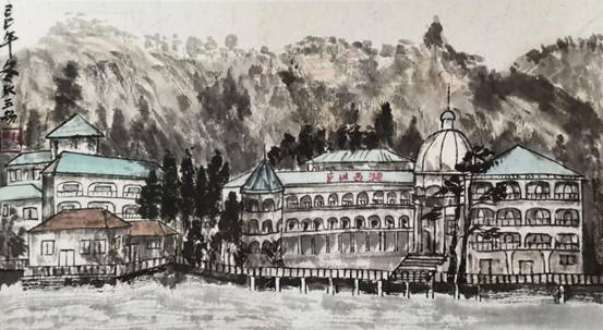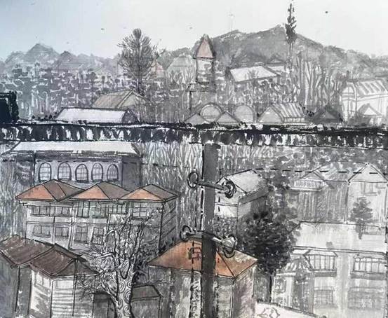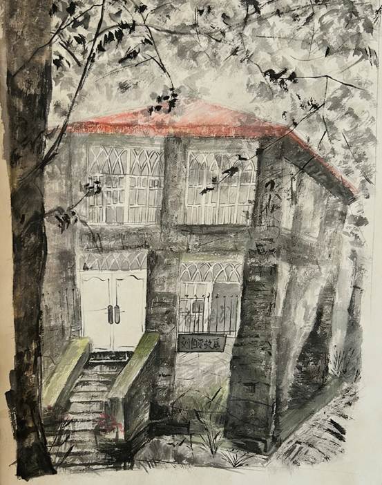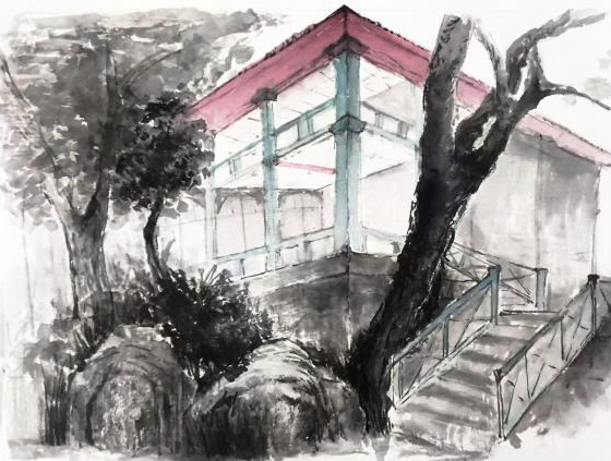 创作心得:老师带领我们踩点结束后,穿过幽暗隧道抵达牯岭镇,眼前豁然开朗。远山如黛,层峦叠嶂,山脚下的民居错落有致,在绿意间晕染出质朴的烟火气。我背着画具,当即寻了一处玻璃栏杆旁落座。通透的栏杆横亘眼前,竟为寻常景致添了几分别致韵味。我灵机一动,决意以栏杆为前景,将近处的屋舍、远处的山峦一并纳入画中。玻璃栏杆的线条简洁利落,恰好框住后方的房屋,制造出独特的纵深感与层次感。