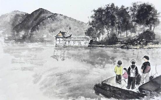 创作心得:这幅画是我在庐山如琴湖边上所看到的一个场景,我站在湖边上良久,目光先被远处的山峦牵走。水墨山水的妙处在于虚实,所以我以淡墨铺陈山体的轮廓,再用焦墨与浓墨叠加出山峦的层次与肌理,让远山藏在朦胧里,还原湖畔晨雾中远山若隐若现的意境。湖面是画面的主体,我没有用繁复的线条勾勒水波,而是让墨色的浓淡变化来展示湖水的质感,我用稍实的线条勾勒湖中央的亭榭,让它自然地嵌在山水之间,成为人与自然相融的载体。而近景的人物是让我感到温馨的一幕,所以我把他们加入到了画面当中,加入了鲜活元素。