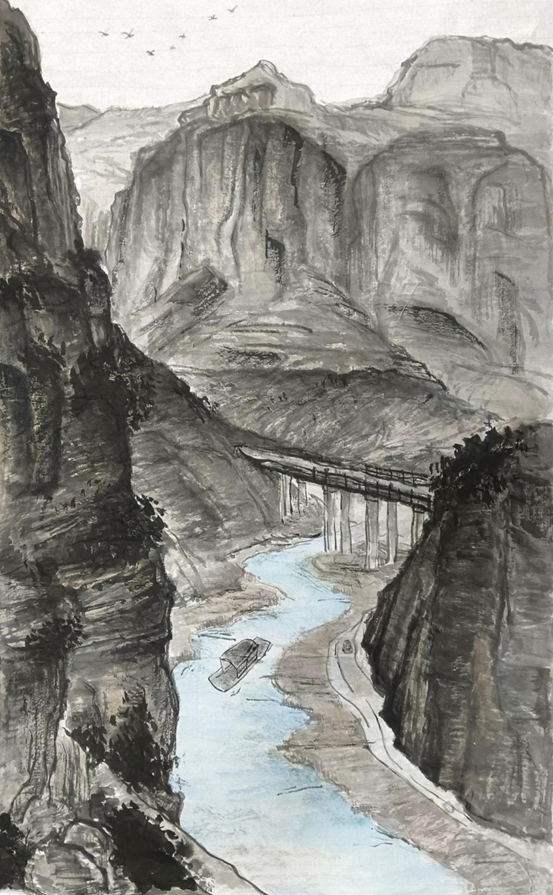 创作心得:画这幅峡谷山水的时候,我尝试着把实景和写意结合起来。挑了峡谷两山夹水的经典样子,用弯弯曲曲的河道和天上的飞鸟衬出空间的深远感。山石用浓墨一遍遍叠加上去,再用斧劈皴勾出棱角,水流就直接抹淡蓝色,和墨色的厚重形成软和硬的对比。还添了现代的栈道,想让老的山水样式能接上现在的地气,最后用刚柔搭配的笔墨,把峡谷又险又灵的感觉抓出来。