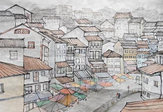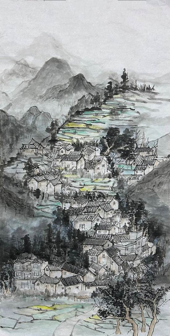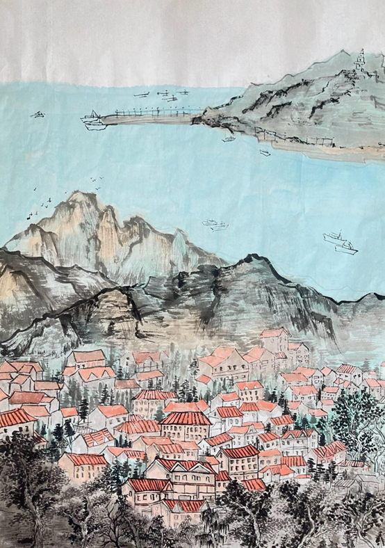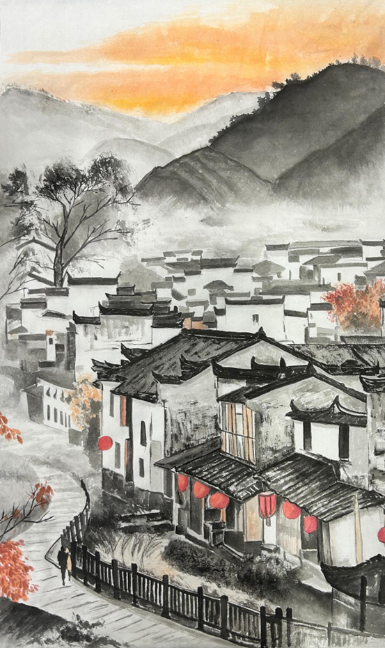 创作心得:我以水墨为骨、淡彩为韵,先以浓淡干湿的墨色勾勒徽派建筑的白墙黑瓦,用焦墨点染屋瓦纹理,淡墨晕染远山的层叠朦胧。暖橙色的霞光打破水墨的清冷,与红枫、红灯笼形成色彩呼应,让画面有了温度。创作中刻意弱化细节,以写意手法表现古村的静谧与悠远,试图让观者透过笔墨,感受到江南村落黄昏时的温婉与诗意,让传统水墨的意境和现实景致相融。