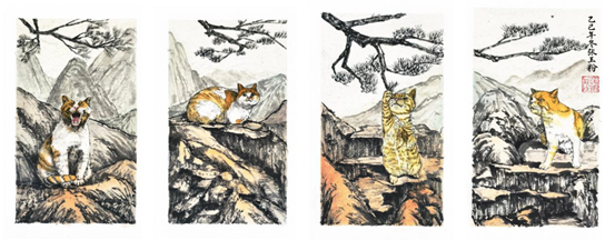 创作心得:国画山水课写生期间偶遇的橘猫,成了我写生里的意外惊喜。起初只是随手勾勒,却被猫咪鲜活的神态打动—打哈欠的慵懒、蜷卧的警惕、伸爪够物的灵动,都让我忍不住想把这些瞬间定格。我试着将猫咪融入山水意境,用山水的皴法衬山石,以淡赭调橘猫毛色,让灵动的生命与苍劲的山水相融。这系列创作让我明白,国画不止是摹写山水,更能捕捉生活里的鲜活意趣,也让我爱上了在笔墨间留住这些可爱瞬间。