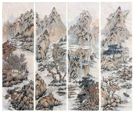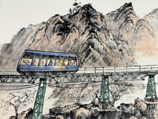 创作心得:《山水四屏》是对"四王"笔墨程式的研习与致敬。我以古人的技法为基础,从山石的结构到树木的姿态,都力求在法度中体现苍润的气韵。设色上采用浅绛法,以赭石、花青为主,层层晕染,追求一种古雅、沉静的气息。而另一幅缆车作品,则是一次跨时空的尝试。我将传统山水的皴擦点染,运用到现代的钢铁建筑之上,并用鲜明的色彩点缀车厢,试图在古意与现实的碰撞中,寻找到一种属于当下的鲜活表达。