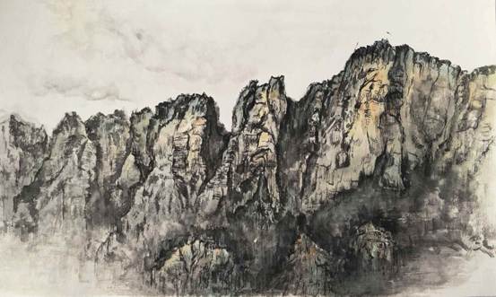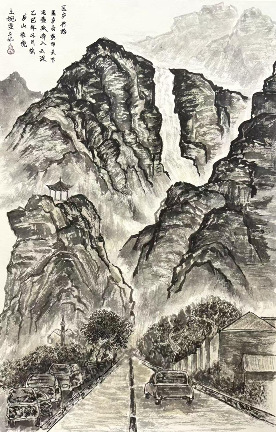创作心得:初次登临庐山,目之所及感受到的是奇峰插云的壮阔,飞瀑穿岩的灵动。我以焦墨勾勒山石的嶙峋骨架,用皴叠染出峰峦的厚重肌理,留白处巧藏飞瀑的流动感。山脚的公路、车辆是现世烟火,与山间古亭相映,让传统山水的意境融进当下生活。乙巳年的庐山,既有“匡庐奇秀甲天下”的古韵,又有人间烟火的鲜活,我便以笔墨为媒,让这份自然与生活的交融,凝于宣纸之上。
