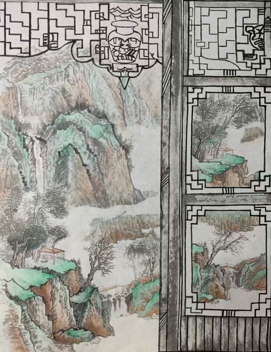 创作心得:这幅作品以窗棂为框,将青绿山水纳于其中,是我对“咫尺山林”中式美学的尝试。先以焦墨勾勒窗格的几何纹样,用规整的线条营造出人工造物的精致,再以淡赭、花青铺染山水,皴擦出山石的肌理与草木的生机,让自然的灵秀打破窗格的规整。一刚一柔、一静一动的对比,意在表现中式审美里“借景”的妙趣,于方寸间藏天地,让观者透过窗棂,触摸到山水的悠远意境。