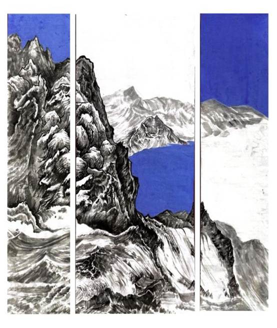创作心得:创作这幅《天池》时,我以三联画的形式打破传统山水的构图局限,用黑白水墨表现雪山的嶙峋肌理,以浓艳的宝蓝块面突出天池的澄澈与静谧,形成强烈的色彩对比。笔触上,我以焦墨勾勒山石的棱角,用积墨法堆叠出雪山的厚重感,留白则模拟云雾与积雪的空濛。创作中我试图融合传统水墨的写意精神与现代构成的形式感,让天池的自然之美在笔墨的虚实相生中,既保留山水的意境,又赋予画面较强张力。