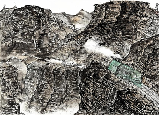 创作心得:立在画板前对着素纸凝思许久,最先被记忆中山石的嶙峋纹理勾住——本来想以细笔勾勒岩缝脉络,墨刚蘸了焦黑,又想起山风掠过峡谷时的苍劲,干脆用干笔皴擦叠出层层墨色,让山石的肌理像浸在沉郁的山岚里。后来添那抹青绿点染火车,是笔上剩了点没洗的石绿,随意涂在墨色山岩间,倒刚好接住了当时见列车穿峡而过的鲜活,像把写生时的震撼都凝在了笔墨里。