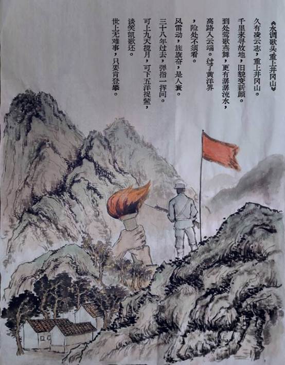 创作心得:“时光流逝,白云苍狗。无数事物成为一缕云烟,消散在历史深处,然而英雄的事迹永远不会磨灭。”当我看着这段鲜红的文字,无数英雄的身影便一一从我脑海浮现,我思来想去,决定只用一位红军的背影来表现,他代表着所有先烈们的守望相助,血染河山的悲壮已由崇高先烈们背负,眼下绿意盎然的井冈山正孕育着红色的希望。同时,一提起井冈山,便不由得想起那位革命领导者,想起他那首《水调歌头·重上井冈山》。