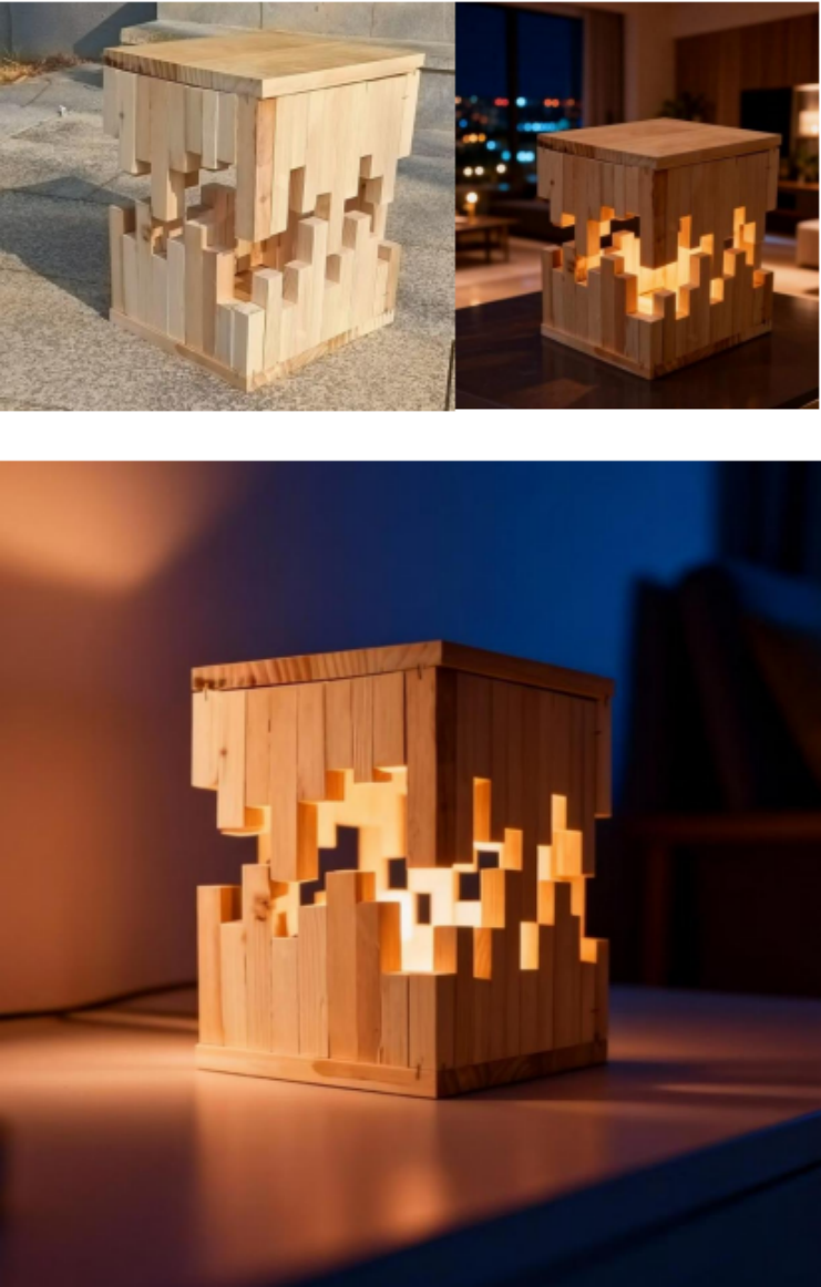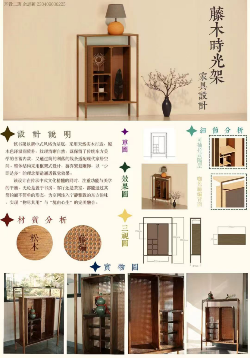 木工传统工艺以其独特的魅力与深厚的文化底蕴,在现代设计的浪潮中熠熠生辉。2025年12月,2023级环境设计1、2、3、4班在陶瓷美术与艺术设计学院三楼大厅举办了《家具设计与木工实训》课程优秀作品展示。本次结课作业汇展,是一次对传统木工技艺的致敬与传承,更是对作业展示形式的新探索,在设计阶段,3、4班的同学将OBE理念融入作品创作当中,“以赛促学”,将设计比赛的要求引入作品创作当中;在木工实训作品展示阶段,创新性地将原本孤立的作品用AI实现“场景化”展示。同学们用灵巧的双手和无限的创意,将一块块平凡的木材雕琢成了一件件独具匠心的作品。从古朴典雅的家具到精致小巧的摆件,每一件作品都蕴含着他们对木工工艺的热爱与执着。本次汇展不仅是一次学习成果的展示,更是一次传统与现代的碰撞与交融。让我们一同走进这个充满魅力的木工世界,感受传统工艺的独特韵味;也致敬本课程老师爱岗乐教、精益求精的教学态度。